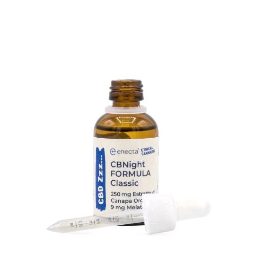 CBNight formula contiene (in 1 ml) 0,3 mg di melatonina, 4,17 mg di cannabidiolo (CBD) e 4,17 mg di cannabinolo (CBN). Questa combinazione è stata studiata per favorire un riposo di qualità, supportando sia l'induzione che il mantenimento del sonno.