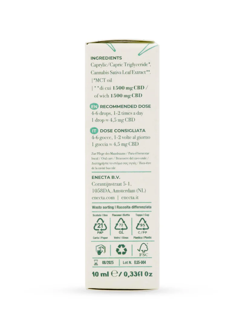 Con una percentuale di CBD del 15%, un boost extra di cannabinoidi e una selezione di terpeni dalle proprietà rilassanti, questo olio di CBD è un alleato naturale per riequilibrare il tuo stato emotivo.